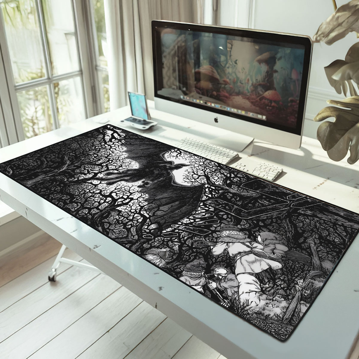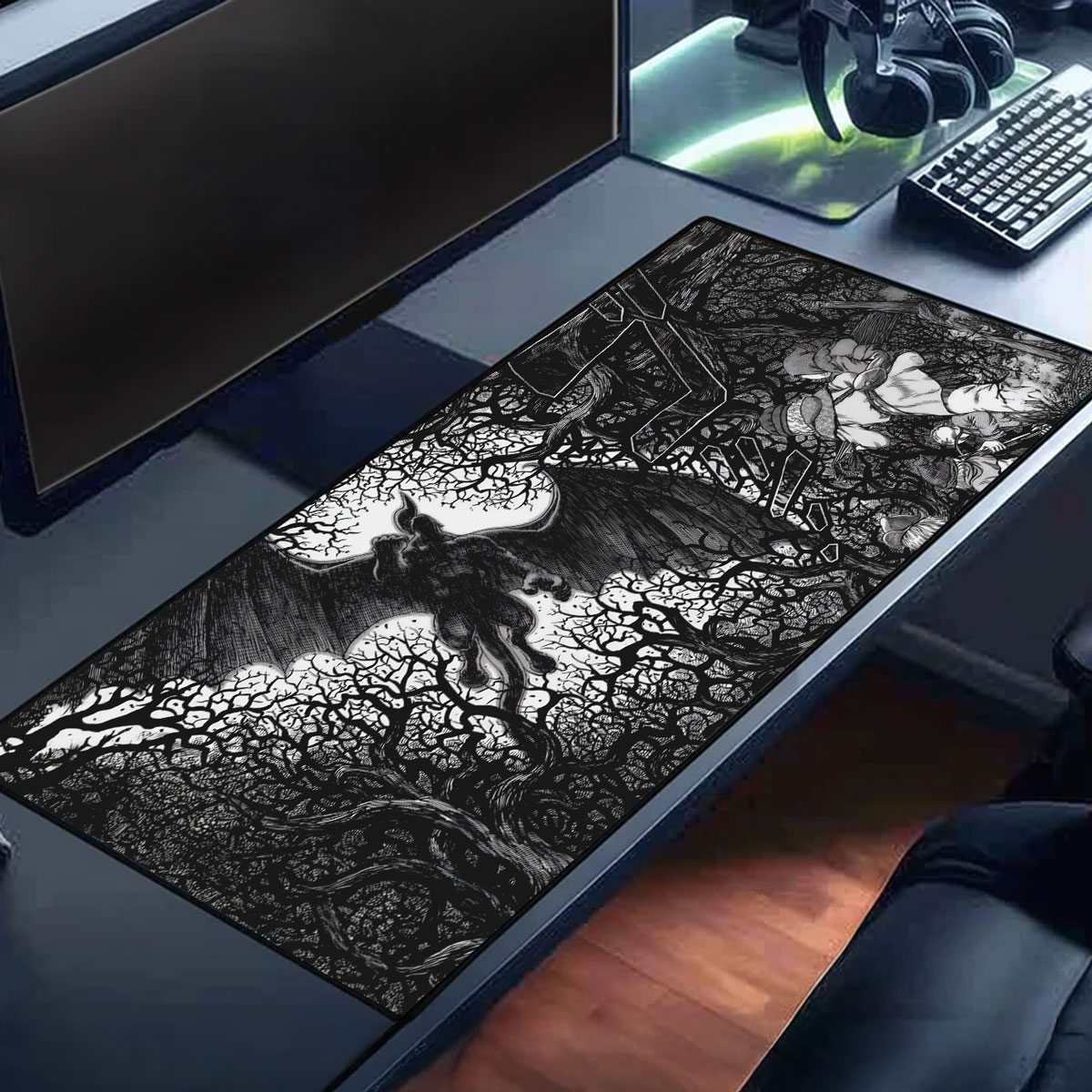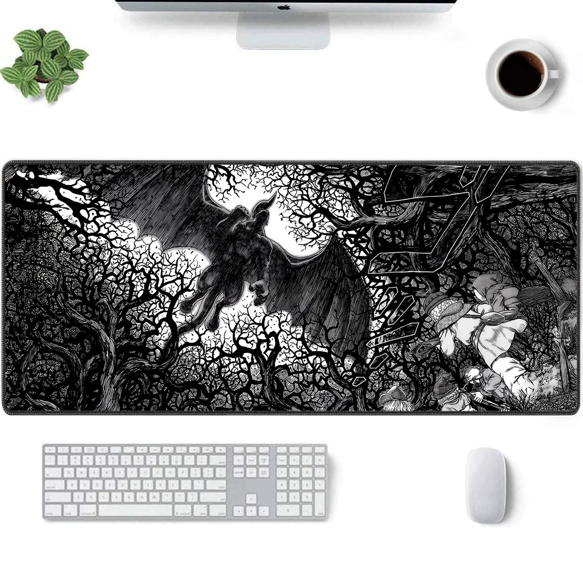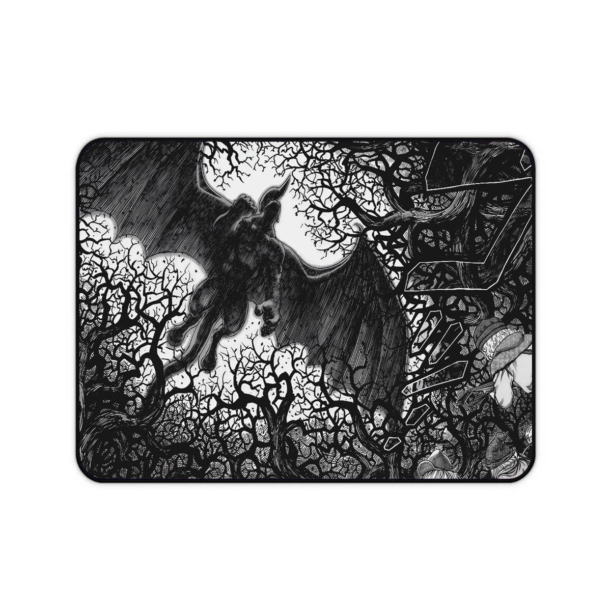 Step into the dark beauty of Berserk with this striking black-and-white desk mat. The Gothic forest scene captures the raw, hand-drawn intensity of the manga — a perfect blend of chaos and elegance. Designed by Neko Mouse Pads, this piece brings artistic darkness and flawless performance to your workspace.