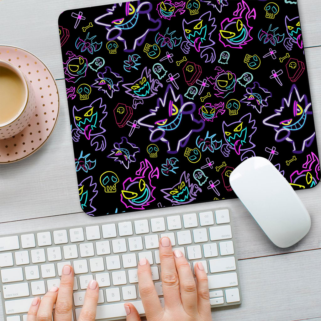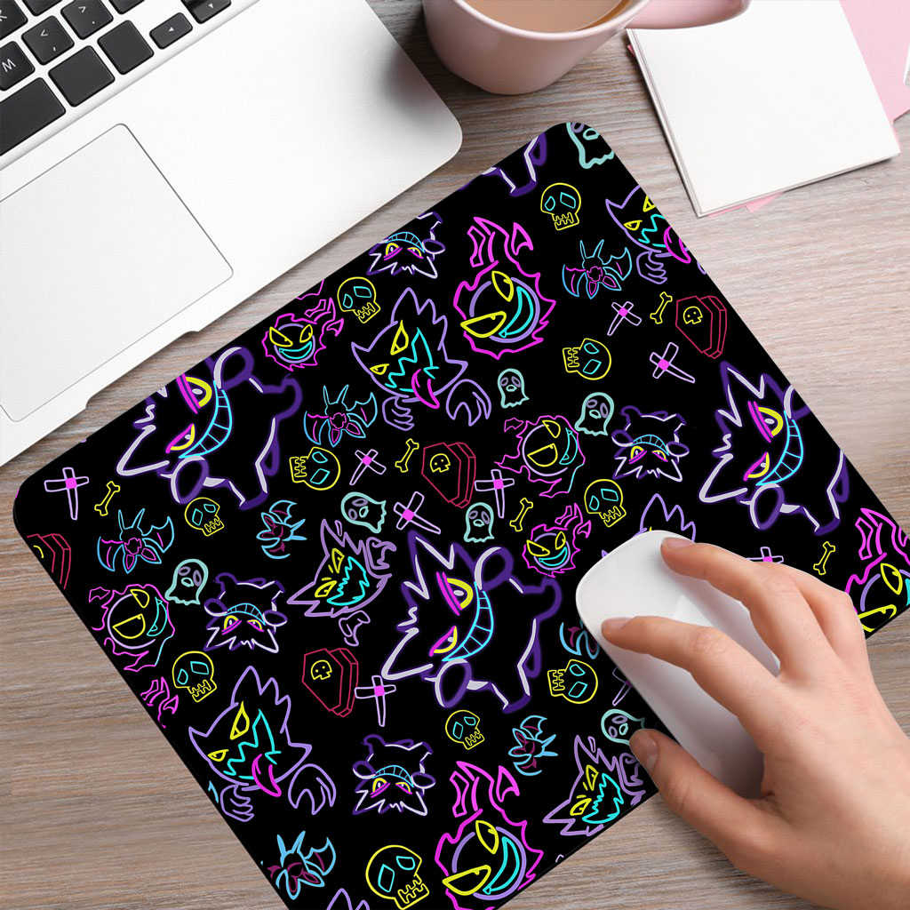 • Original Design Mouse Mat – Dive into darkness with Gengar in vibrant neon line art. Perfect for fans of the mysterious Ghost-type Pokémon.