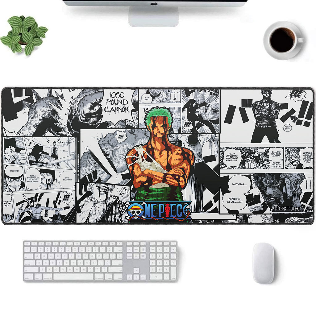 Show your love for One Piece with this Zoro desk mat, designed with a powerful manga panel background in monochrome black and white. The vibrant Zoro artwork at the center stands out perfectly, making it a must-have for anime fans who want both functionality and style on their desk. A must-have desk accessory for any Straw Hat fan.