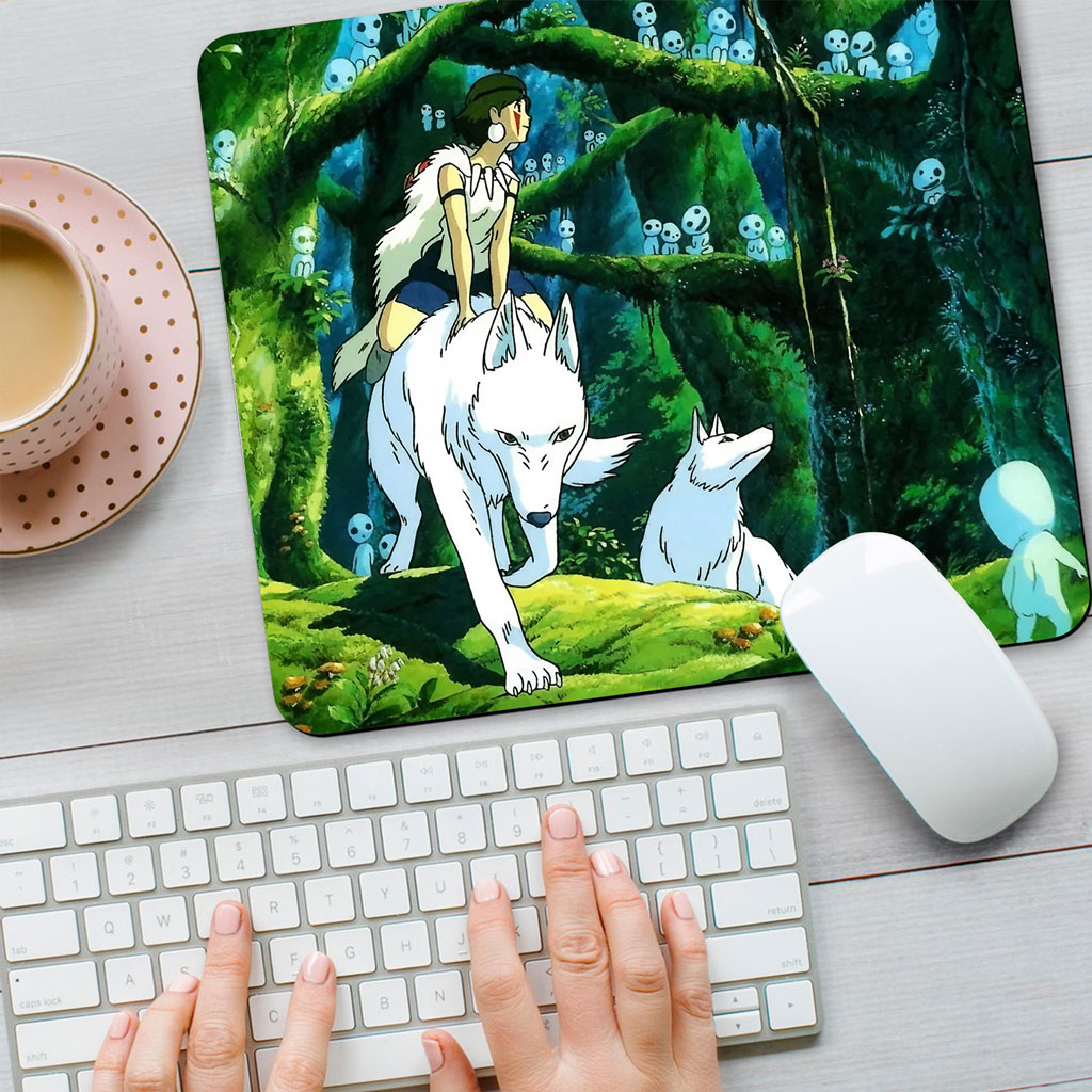 Bring the magic of Studio Ghibli to your desk with this Princess Mononoke mouse pad. Featuring San riding her wolf companion in a vibrant forest filled with Kodama spirits, this desk mat offers a smooth surface for precise mouse movement and a non-slip base for stability. Perfect for work, gaming, or adding a touch of anime charm to your setup.